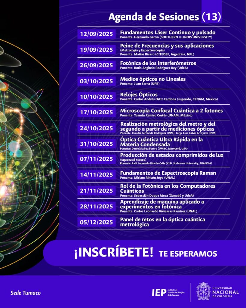 Curso virtual introductorio dirigido a todo público interesado en conocer cómo la fotónica avanzada impulsa la metrología y la computación cuántica. En 13 sesiones, expertos nacionales e internacionales explicarán conceptos como láseres pulsados, peines de frecuencia, interferometría, medios ópticos no lineales, relojes ópticos y aprendizaje de máquina aplicado a experimentos fotónicos. Una oportunidad única para explorar el papel de las tecnologías cuánticas en el desarrollo científico y tecnológico del país.